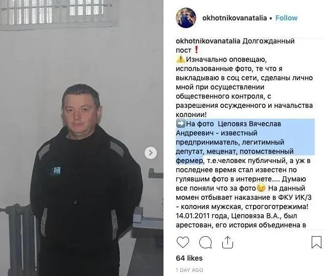 13 ноября на своей странице в социальной сети Instagram Наталья Охотникова опубликовала фотографию Вячеслава Цеповяза, который отбывает 19-летний срок в ИК-3 Амурской области.