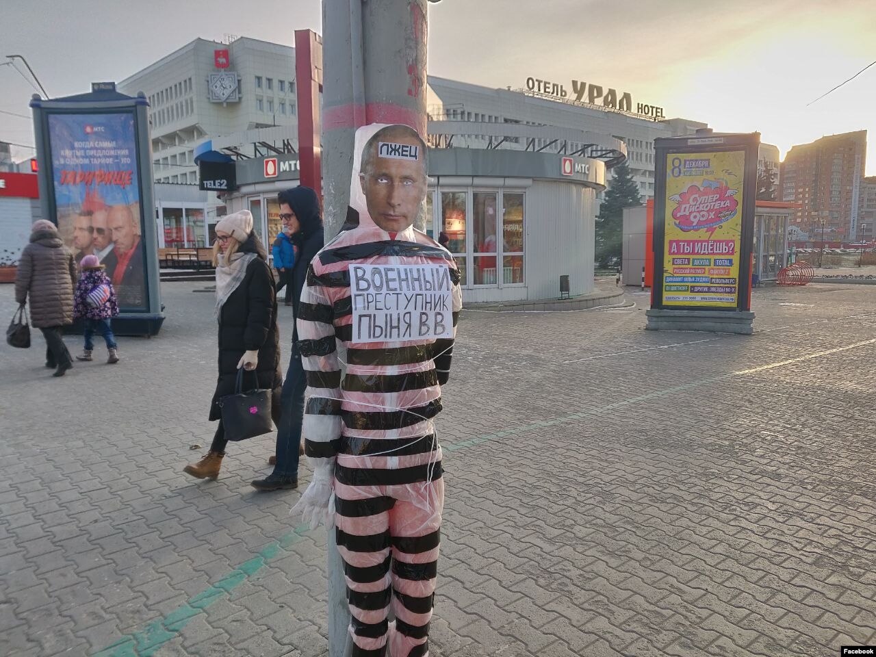 В центре Перми 12 ноября к столбу привязали чучело с лицом Путина. На лбу у манекена, одетого в тюремную робу, был приклеен листок со словами “лжец”. На груди – фраза “Военный преступник Пыня В.В.”. Вскоре к месту размещения инсталляции приехали сотрудники Росгвардии, затем полицейские и люди в штатском. По словам очевидца, секретаря регионального отделения Либертарианской партии России в Пермском крае Александра Котова, около десяти представителей силовых структур собрались вокруг чучела. В этот день пресс-служба МВД по Пермскому краю заявила, что силовики ищут автора арт-объекта.