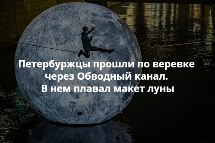 Участники команды профессиональных слэклайнеров FlowBalance из Петербурга Александр Грибанов и Максим Кагин прошли по веревке, натянутой между противоположными набережными Обводного канала. Они сделали фото с макетом луны, который временно оставили там сотрудники Планетария № 1.