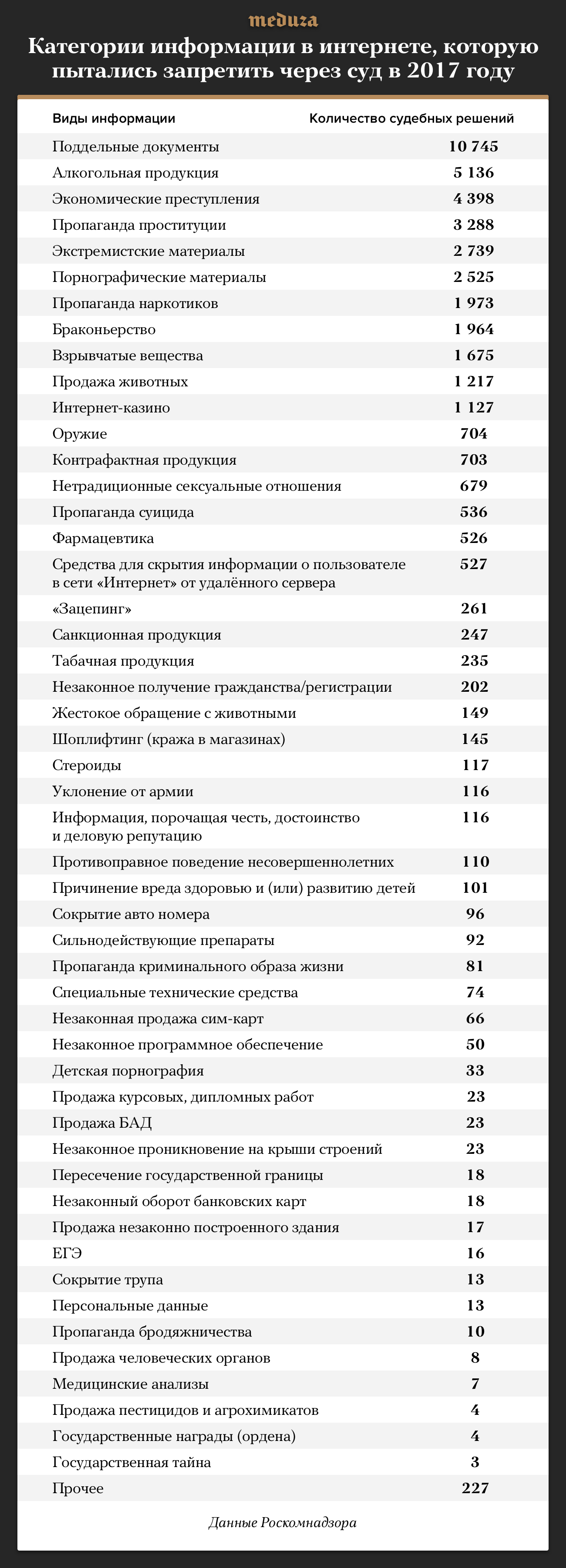 Это любимый пункт у прокуроров, которые через суд добиваются блокировки сайтов, нарушающих, по их мнению, закон. Роскомнадзор ведет учет таких блокировок: по данным ведомства, разнообразие оснований увеличивается с каждым годом.
