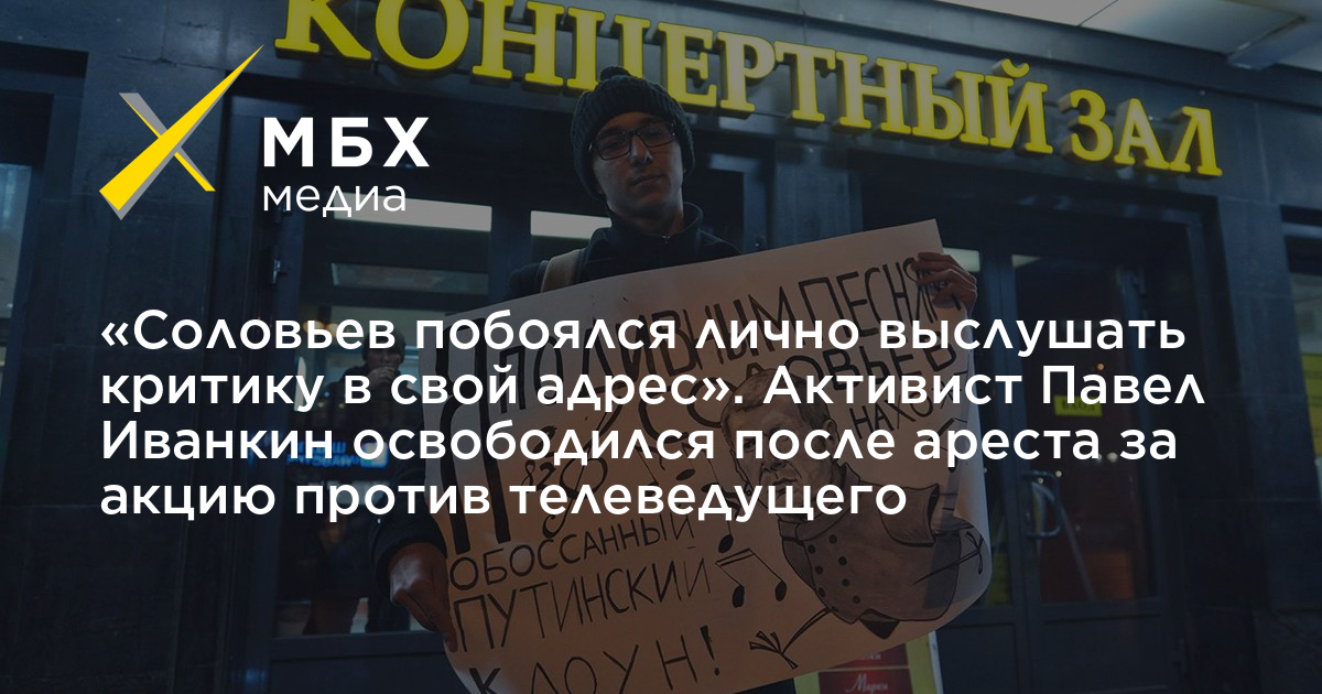 В своих радиопередачах на «Вести ФМ» известный телеведущий Владимир Соловьев уже вторую неделю ругает активистов, которые устроили пикеты в Петербурге в его честь. В начале ноября молодые люди встретили Соловьева приветственным плакатом «Юлиус Штрейхер» у ДК им. Ленсовета, где позже состоялся концерт телеведущего. Штрейхер был главным редактором антисемитской газеты нацистской Германии и идеологом расизма. Полиция арестовала семерых пикетчиков, шестерых отпустили домой без протоколов. Павла Иванкина привлекли к административной ответственности. Петроградский районный суд признал его виновным в нарушении части 1 статьи 19.3 «Неповиновение законному распоряжению сотрудника полиции», и отправил под стражу на 10 суток. После освобождения Павел встретился с корреспондентом «МБХ медиа» и рассказал, как полиция спасала честь пропагандиста.