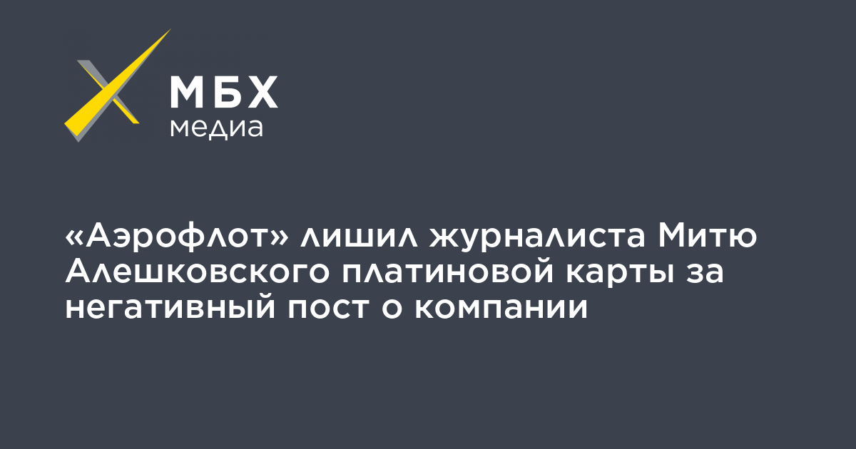 Авиакомпания «Аэрофлот» лишила директора портала «Такие дела» Дмитрия Алешковского платиновой карты за публикацию о компании в Twitter, которую посчитали негативной. Об этом он сообщил на своей странице в Facebook.