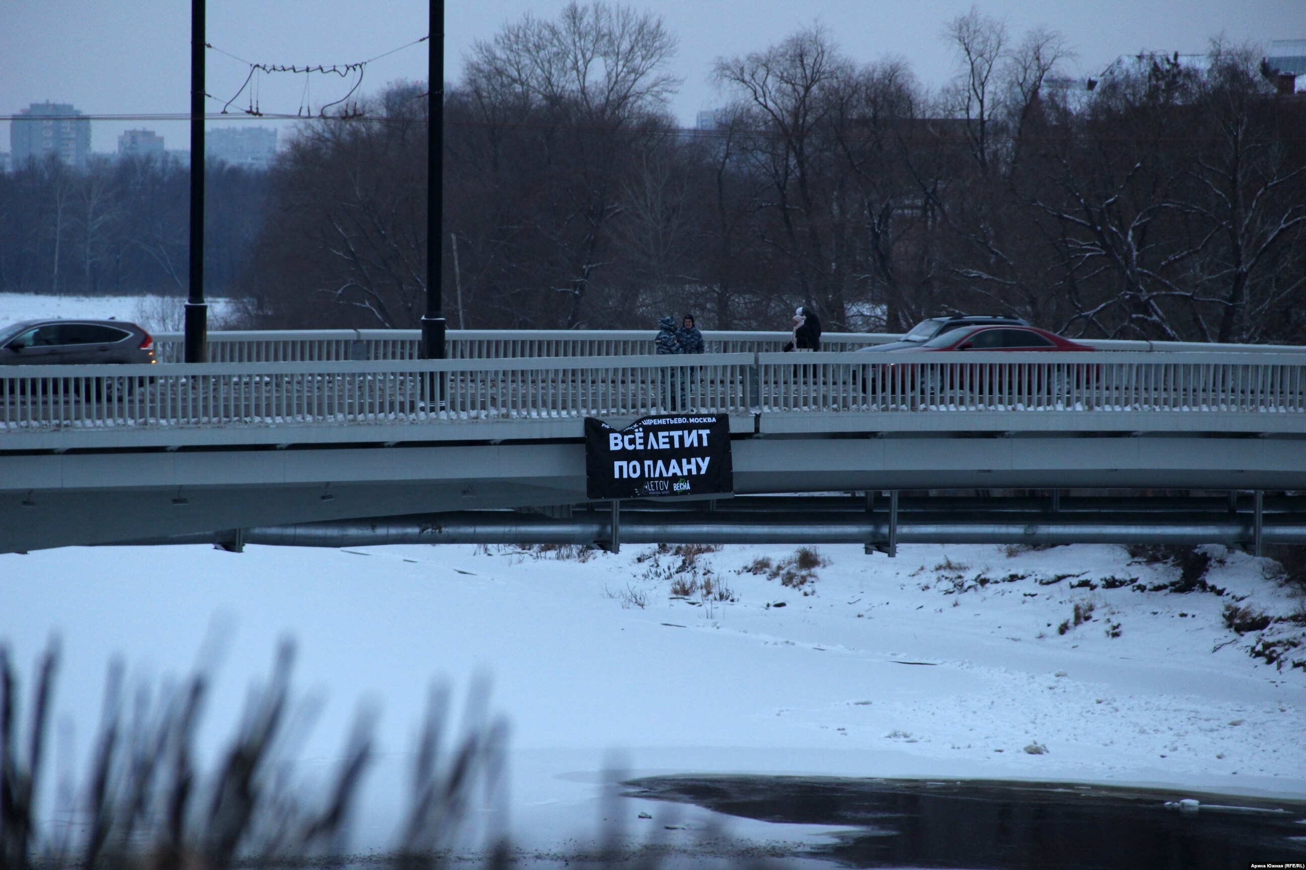 По словам Даниила Чебыкина, акцию придумали представители молодежного движения "Весна". Сегодня они вывесили аналогичный баннер на мосту по дороге в Шереметьево.