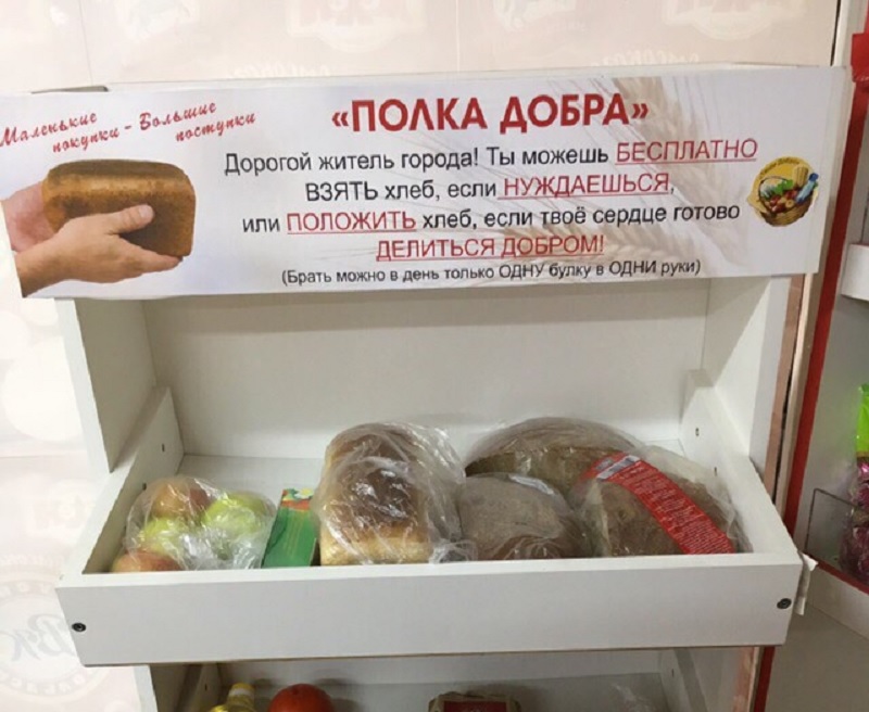 В Магниторгорске уже год активно развивается волонтерский благотворительный проект «Полка добра». В нескольких магазинах города появились полки, куда все желающие кладут хлеб, а нуждающиеся могут взять его.