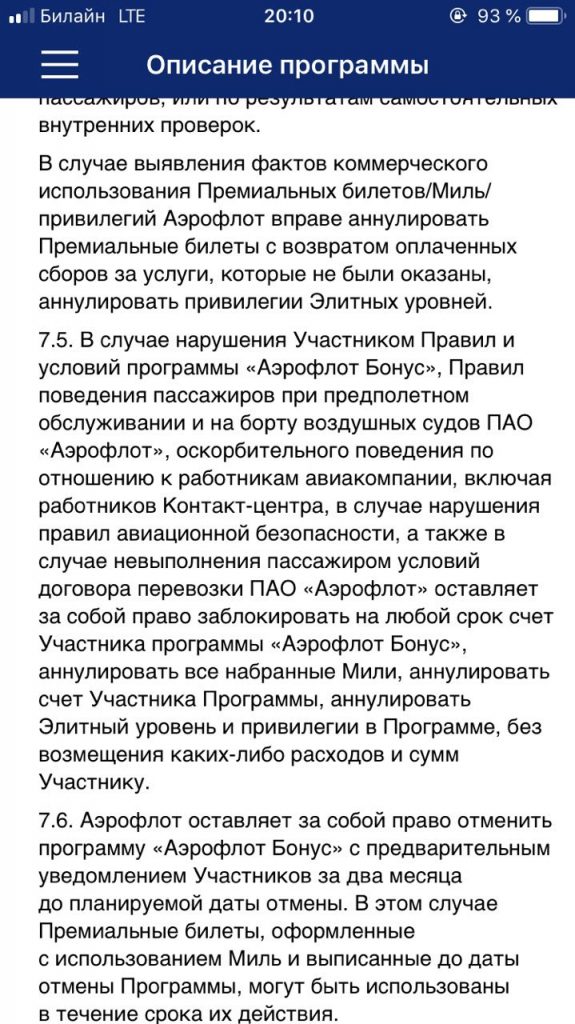 Скриншот правил бонусной программы в iOS-приложении «Аэрофлота»