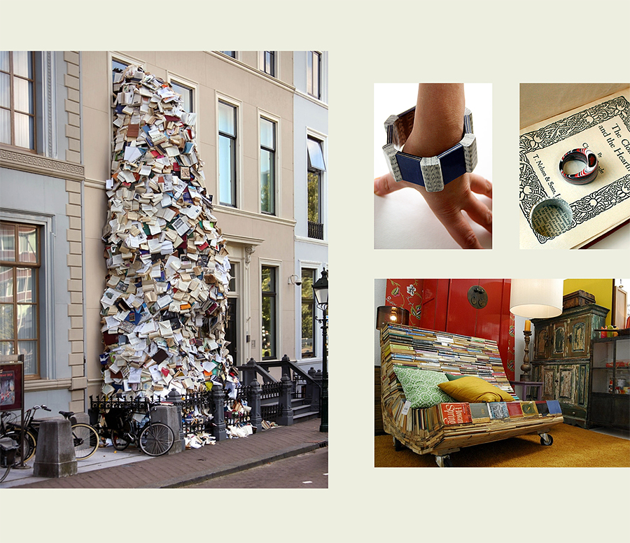 Испанец Альваро Тамарит сооружает диваны целиком из старых книг. Голландец Ричард Хаттен превращает стопки книг в изящные столики. Американец Джим Розенау выпустил целый набор авторской мебели подобного рода. Подражая знаменитым клатчам Олимпии Ле-Тан, мастерски имитирующим печатные издания, доморощенные умельцы кинулись массово штамповать «литературные сумочки». В теме не только иностранцы, но и россияне — достаточно посетить известный сайт «Ярмарка мастеров».
