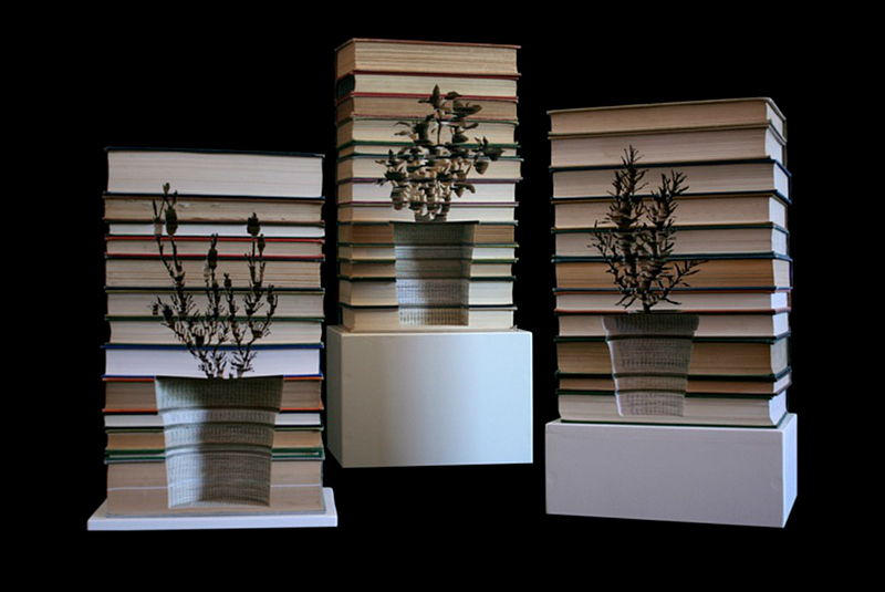 Сью Блэквелл выстригает из сказок иллюстрации, склеивает их с текстом, подвешивает на лесках и размещает на плоскости, обыгрывая эффекты светотени. Джорджия Рассел разделяет страницы на тонкие полоски и делает фантазийные панно. Томас Аллен создает летящие силуэты литературных персонажей из книжных листов. Николас Джонс ваяет скульптуры из твердых обложек. Роберт Зе мастерит бумажные швабры из Британской энциклопедии, пистолеты — из психотерапевтических пособий, тараканов — из художественных альбомов. Кайли Стиллман вырезает контррельефы из книг в виде экзотических деревьев и цветочных букетов. Ланди Капп высекает на книжных обрезах впечатляюще реалистические лица.