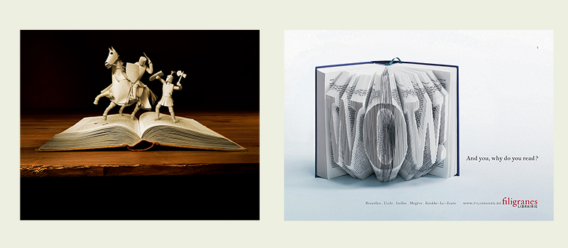 Буккарвинг незаметно проникает и в публичные практики. Вспомним торжественную церемонию завершения Сочинской олимпиады — с обильным дождем из книжных страниц. Рекламу «Недели книги» в Нидерландах представляла работа буккарвера Исаака Салазара. Формат книжной скульптуры обыгрывается в постерах пражского магазина «Anagram».