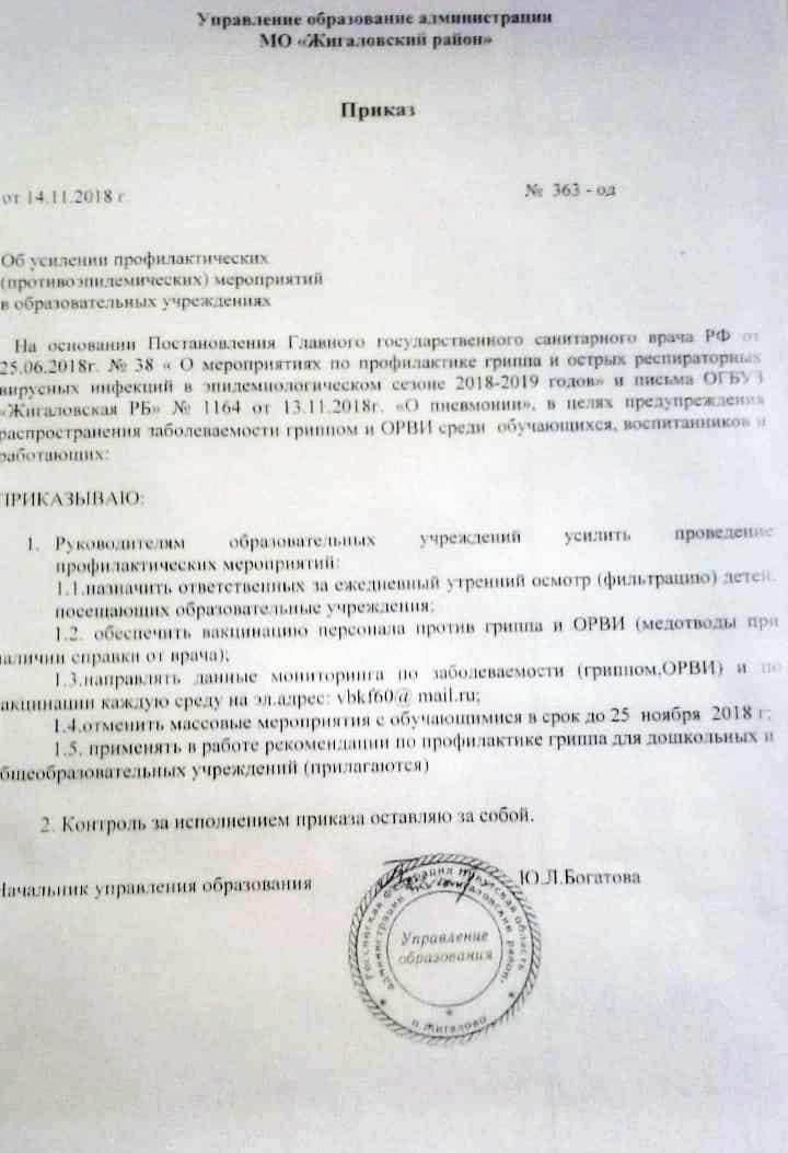 Косвенно информацию об эпидемии подтверждает рассылка "О пневмонии", отправленная неделю назад Жигаловской районной больницей по бюджетным организациям поселка. На основании документа глава управления образования администрации Жигаловского района Юлия Богатова ввела ежедневную фильтрацию детей в учебных заведениях района. Кроме того, администрация предписала вакцинацию персонала и отменила до 25 ноября все массовые мероприятия.