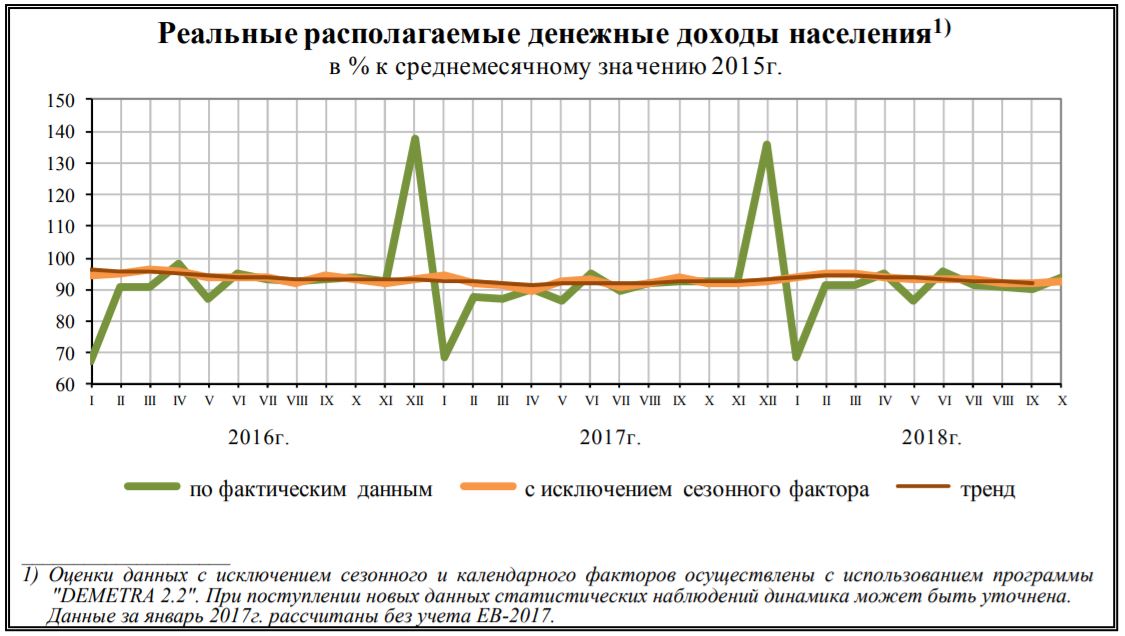 • Смотреть надо не на ряды из статистики Росстата, а на тренды, считает Тремасов, по реальным доходам, например, это приближение к стагнации. В 2019 году можно в лучшем случае рассчитывать на вялый рост располагаемых доходов от 0 до 1% год к году, но более вероятно падение — грядет повышение НДС и разгон инфляции, пусть эти негативные эффекты и ослабит повышение пенсий.