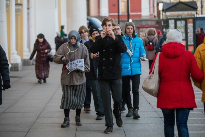 На Невском проспекте прошла акция в День телевидения. «Пропагандист» вел за собой людей с петлями на шее