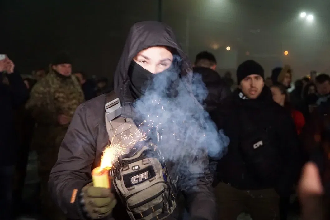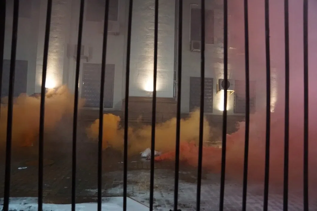 После того, как полиция пресекла попытку поджога, активисты стали кидать дымовые шашки на территорию посольства.