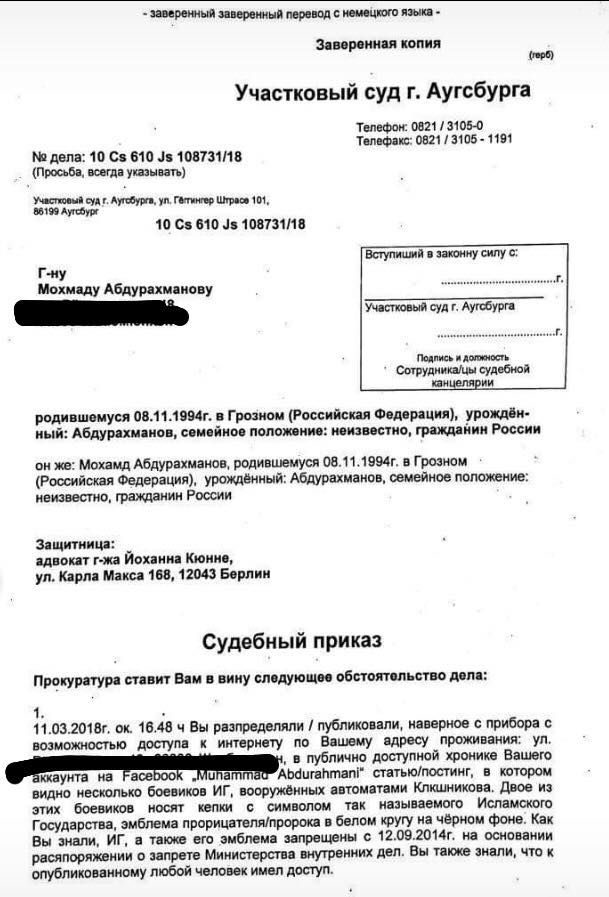 Суд Аугсбурга оштрафовал чеченца Мухаммада Абдурахманова на 1125 евро за репост статьи Deutsche Welle об экстремистской группировке "Исламское государство".