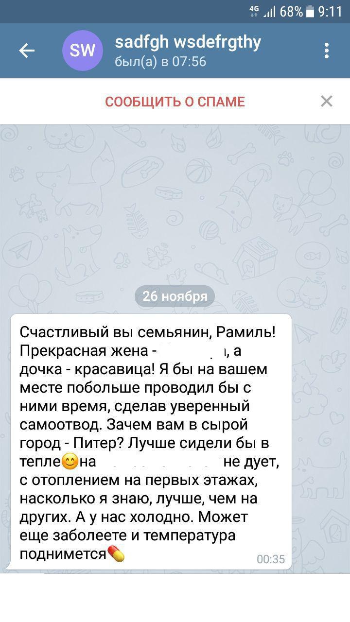 В сообщении в Telegram от пользователя со случайным набором букв в имени упоминаются адрес Ахметгалиева, сведения о его семье, а также грядущая поездка в Петербург, во время которой «еще заболеете и температура поднимется».