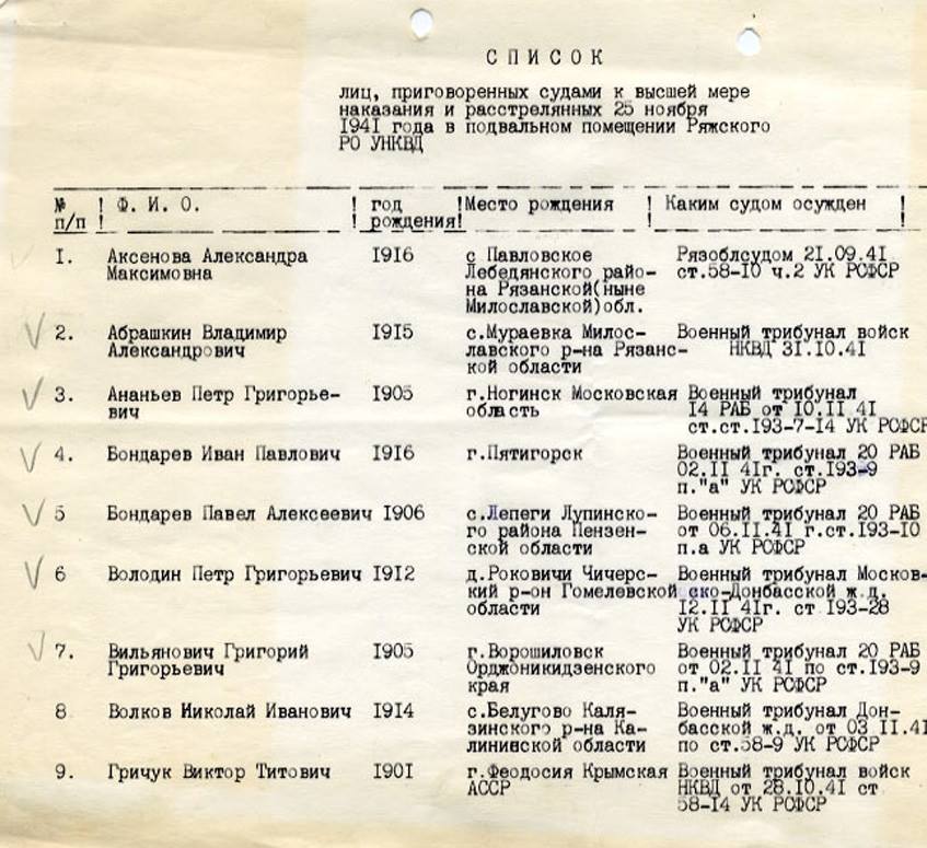 АРАУШКИН Владимир Александрович, 1915 (26 лет), заключенный; АБРАШКИН Владимир Александрович, 1915 (26 лет), военнослужащий; АКСЕНОВА Александра Максимовна, 1916 (25 лет), член религиозной общины Истинно Православной Церкви (ИПЦ); АНАНЬЕВ Петр Григорьевич, 1905 (36 лет), военнослужащий; БОНДАРЕВ Иван Павлович, 1916 (25 лет), военнослужащий; БОНДАРЕВ Павел Алексеевич, 1906 (35 лет), военнослужащий; ВИЛЬЯНОВИЧ Григорий Григорьевич, 1905 (36 лет), военнослужащий; ВОЛКОВ Николай Иванович, 1914 (27 лет), рабочий; ВОЛОДИН Петр Григорьевич, 1912 (29 лет), военнослужащий; ГЕОРГИЕВСКАЯ Анна Михайловна, 1882 (59 лет), учительница; ГОЛУБЫХ Мария Васильевна, 1900 (41 год), член религиозной общины ИПЦ; ГРЕЧУК (Гричук) Виктор Титович, 1901 (40 лет), военнослужащий; ДАНИЛОВ Николай Иванович, 1917 (24 года), военнослужащий; ДЕНИСОВ Сергей Егорович, 1921 (20 лет), военнослужащий; ДУГОВ (Дубов) Степан Яковлевич, 1912 (29 лет), религиозный активист; ЕЛИСЕЕВА Наталья Лазаревна, 1884 (57 лет), член религиозной общины; ЖДАНОВА Мария Федоровна (Сергеевна), 1908 (33 года), член религиозной общины; ИВАНОВ Иван Васильевич, 1907 (34 года), военнослужащий; КОПЫТИНА Варвара Ивановна, 1890 (51 год), член религиозной общины ИПЦ; КОШКАРОВ Афанасий Федорович, 1914 (27 лет), военнослужащий; КУЗЬМИЧЕВ Степан Павлович, 1914 (27 лет), военнослужащий; МЕДВЕДКОВ (Медведев) Николай Николаевич, 1914 (27 лет), заключенный; НАУМОВА Дарья Федотовна (Федоровна), 1886 (55 лет), член религиозной общины ИПЦ; НЕВЕЙКИНА (Новейкина) Татьяна Михайловна, 1883 (58 лет), член религиозной общины ИПЦ; ПАНОВ (Анов) Василий Евграфович, 1894 г.р. (47 лет), военнослужащий; ПАШИНИНА (Пяшинина) Нина Андреевна, 1915 (26 лет), член религиозной общины ИПЦ; ПОСРЕДНИКОВ Федор Павлович, 1920 (21 год), военнослужащий; САУРМИЛИХ (Саурмилин) Давид Давидович, 1913 (28 лет), спецпоселенец; СИБКО (Сипко) Петр Степанович, 1913 (28 лет), военнослужащий; СКОТНИКОВ Александр Иванович, 1894 (47 лет), крестьянин; ТОЛСТОВ Соломон Иванович, 1908 (33 года), военнослужащий; ТОМИН Илья Тихонович, 1902 (39 лет), рабочий; ХИЛЕНКО Александр Григорьевич, 1912 (29 лет), военнослужащий; ЧЕСНАКОВА (Чеснокова) Евгения Сергеевна, 1880 г.р. (61 год), член религиозной общины ИПЦ; ЧУДАКОВ Николай Тимофеевич, 1902 (39 лет), рабочий; ШЕРСТНЕВА Марфа Ивановна, 1895 г.р. (46 лет), член религиозной общины ИПЦ; МЕШКОВ А.Е, участковый милиционер Ряжского РОНКВД Рязанской области. [ПРИМЕЧАНИЕ: по сведениям Рязанского общества Мемориал участковый Мешков А.Е. 25 ноября 1941 года отказался принять участие в массовой расстреле. И был сам застрелен участниками казни. Дело получило огласку и участники убийства офицера милиции были отданы под трибунал ].