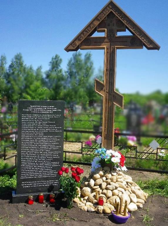 На памятной плите начертаны имена всех 36 расстрелянных, указаны год и место их рождения. Поклонный Крест и памятная доска были установлены "попечением благочинного Ряжского ЦО Скопинской епархии Рязанской митрополии РПЦ протоиерея Андрея Силинского и родственников пострадавших за веру: Голубых Марии Васильевны; Ждановой Марии Федоровны; Чесноковой Евгении Сергеевны; Чесноковой Марии Ивановны (монахини Сезеновского монастыря)". Инициаторы установки Знака отмечают важную роль комиссии по канонизации Липецкой митрополии РПЦ. 26 мая 2018 года епископ Скопинский и Шацкий Феодорит освятил Поклонный Крест и памятную доску.