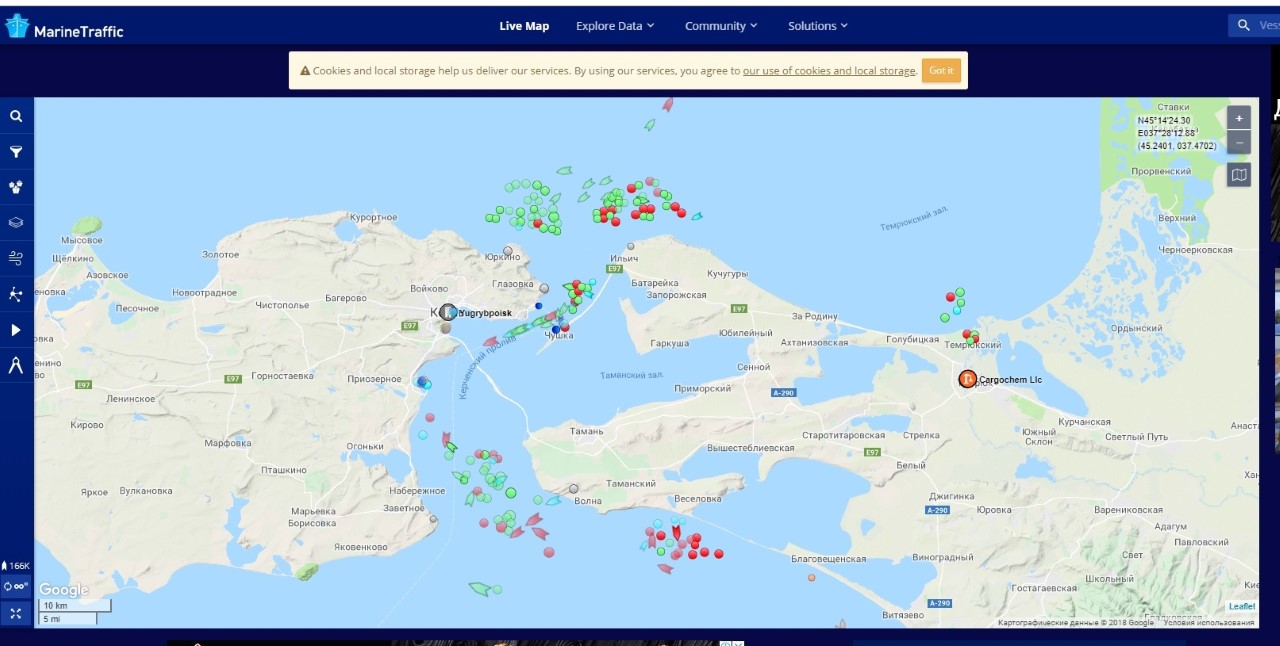 Согласно данным онлайн-сервиса по слежению за судами МarineТraffic, вечером 28 ноября у входа в Керчь-Еникальский канал скопилось большое количество судов по обе стороны от Керченского моста. Среди судов, которые в настоящее время находятся в этой зоне – сухогрузы и танкеры под флагами Панамы, Мальты, Азербайджана и других стран.