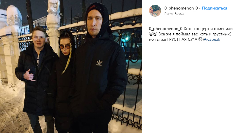 «Сегодня наш концерт в Перми был сорван. Тачка с фсбшниками ездила за нами по всему городу и до сих пор дежурит под окнами. Несколько следующих наших концертов тоже под угрозой срыва. Спасибо, мы чувствуем себя в безопасности. Едем дальше», — говорится на странице IC3PEAK во «ВКонтакте».