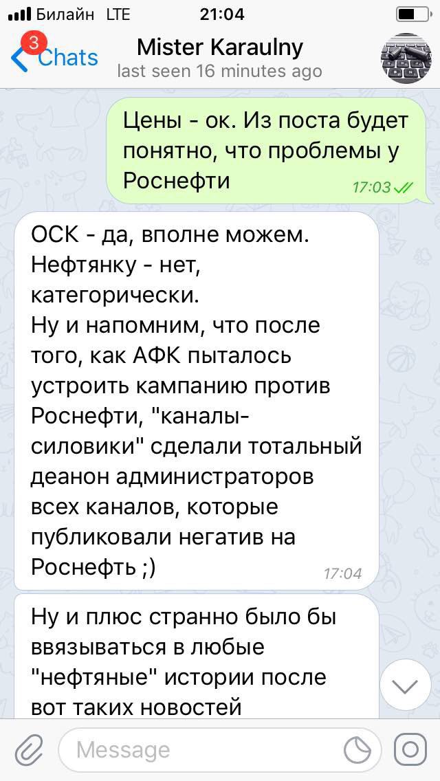 Осенью 2017 года писатель Эдуард Багиров и связанная с властями политтехнолог Марина Юденич вели переговоры с пресс-секретарем «Роснефти» и другом Багирова Михаилом Леонтьевым. Они убеждали представителя нефтяной компании заняться Telegram, начав с покупки одного из каналов. Переговоры увенчались успехом — нефтяная компания предположительно выделила 10 миллионов рублей на покупку крупного канала «Караульный», который до того вела группа провластных журналистов и политологов, подлинность этой истории «Проекту» подтвердили пять собеседников, близких к Кремлю Технически продать канал очень просто — нужно передать покупателю свою SIM-карту, рассказывает человек, участвовавший в покупке других telegram-каналов. Он, однако, отмечает, что часто из-за необходимости физически отдать SIM-карту переговоры срываются.