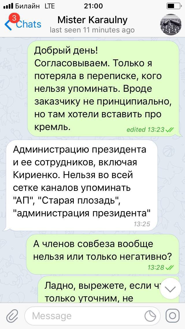 Пока мы предлагали разместить позитивный по отношению к власти материал, никаких проблем не возникало. Но затем мы попытались предложить негативный пост и тут же получили отказ. Чтобы «неприятных» разговоров больше не было, администратор «Караульного» выставил четкие условия: никакого негатива по отношению к членам Совета безопасности (позитивно — можно), вообще нельзя упоминать администрацию президента, Старую площадь, сотрудников Кремля, включая, это отмечалось особо, Сергея Кириенко.
