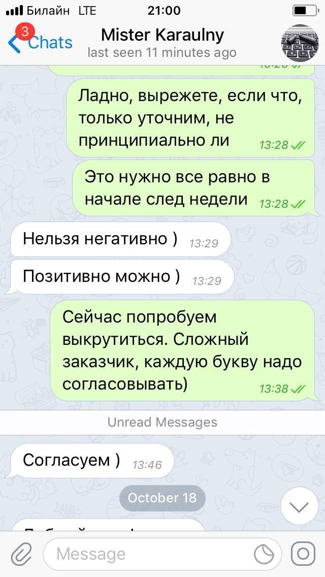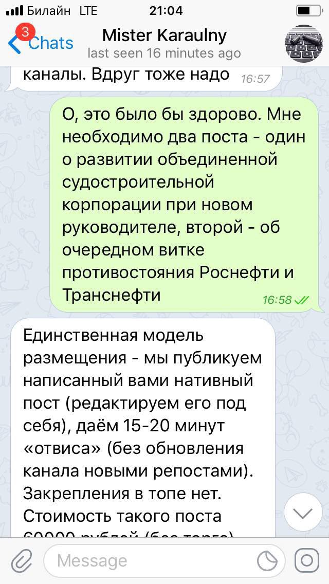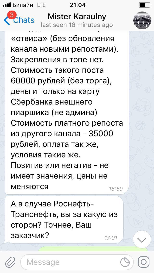 Когда мы списались с «Караульным» под видом заказчика и предложили материал о госкомпании, то тут же получили вопрос — будет он негативным или позитивным. Узнав, что материал может быть негативным, администратор сразу отказался от сделки.