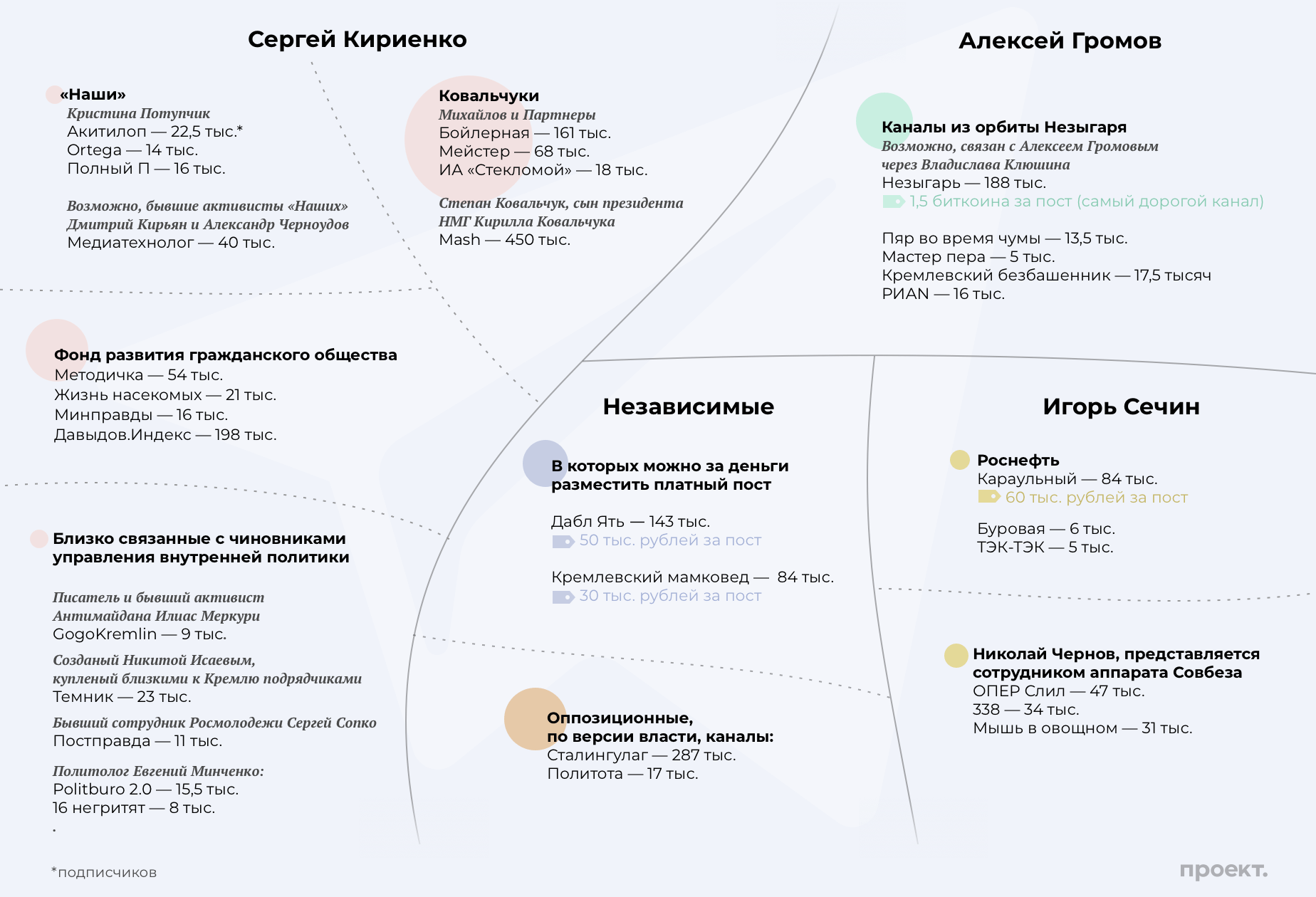 Эта история показательна тем, что крупные политические группы также интересуются telegram-каналами. Ковальчуки пришли на рынок с приближением президентских выборов. Сначала всю работу с каналами выполняла близкая им компания «Михайлов и Партнеры» и связанное с ним агентство Agency One. С ними собеседники «Проекта» связывают массовые каналы — например, «Мейстер» (68 тыс. подписчиков) и «Бойлерную» (162 тыс. подписчиков). Многие собеседники «Проекта», близкие к Кремлю, убеждены, что как минимум одно время связанные с Ковальчуками структуры контролировали и «Незыгаря». Впрочем, два человека, близких к их холдингу, уверяют, что это не так, и роль Ковальчуков на рынке сильно преувеличена. Представитель «Михайлов и Партнеры» сказал «Проекту», что агентство не владеет каналами и не ведет их.