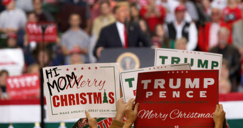 Сторонники Дональда Трампа держат плакаты во время его выступления. Фото: Kevin Lamarque / Reuters