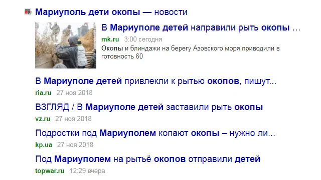 Целый ряд российских медиаресурсов четвертый день оплакивает судьбу сирот из Мариуполя, которых «сняли с уроков в школе, и на холоде, под предлогом уборки территории, бросили рыть окопы для ВСУ». Вот вам и правда о военном положении, введенном в отдельных регионах Украины! К слезам и гневу прилагается видеосюжет авторства мариупольского телеканала ТВ-7.