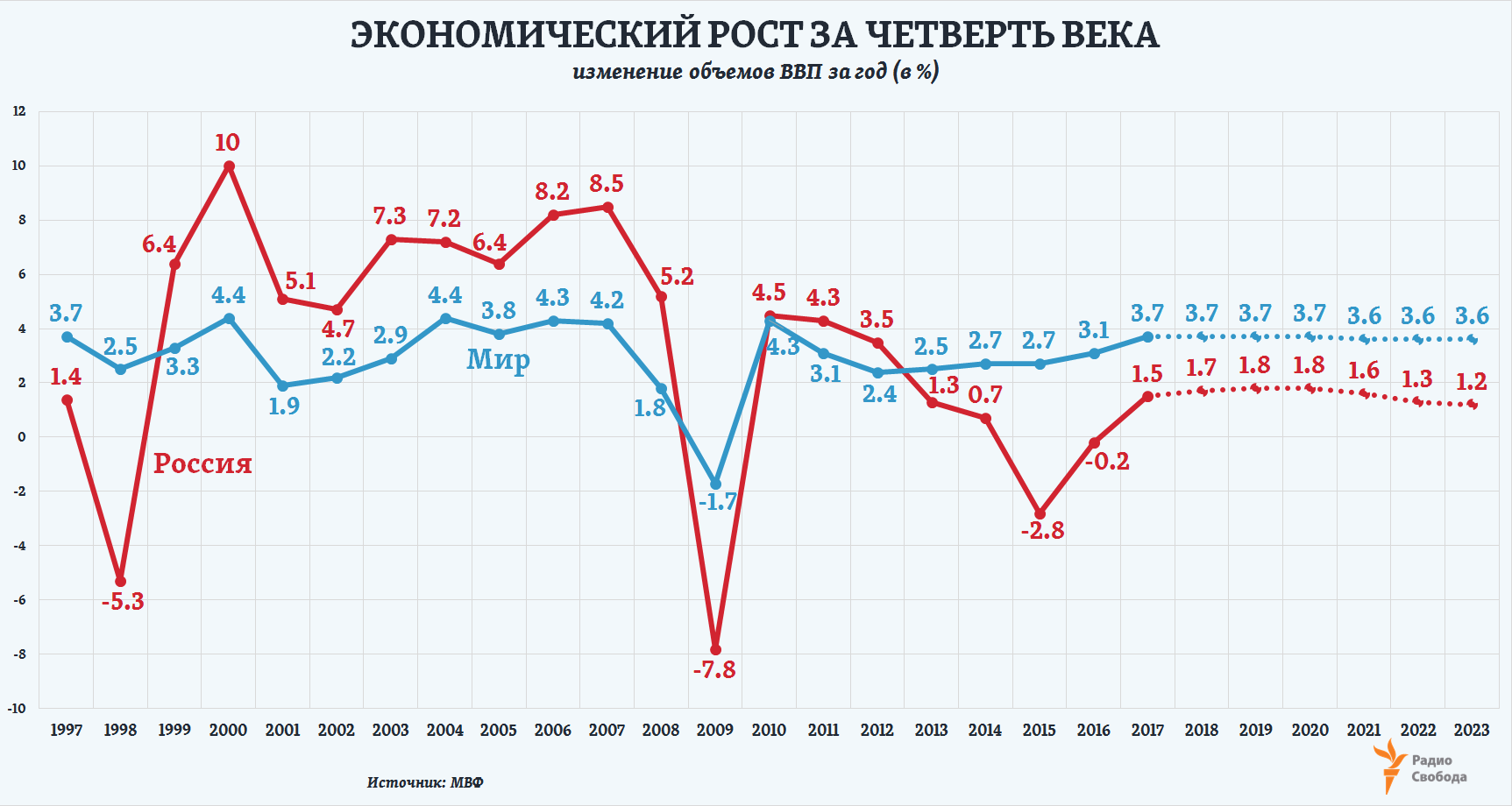 Сегодня экономический рост в России, наоборот, отстает более чем вдвое от общемировых темпов. Причем еще через пять лет этот разрыв может не только не сократиться, но даже вырасти – уже до 3-кратного. Такие оценки приводятся в текущем прогнозе МВФ: