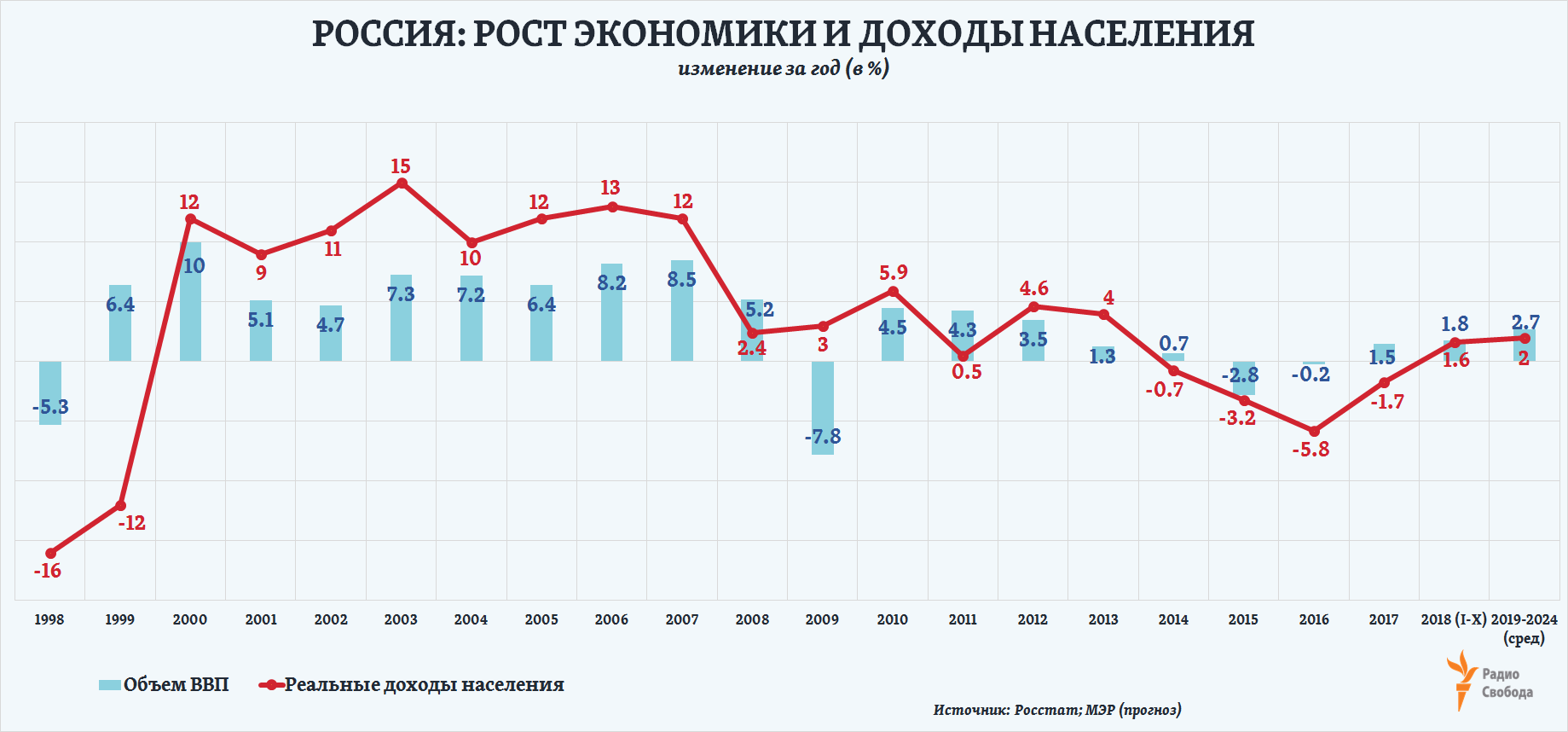 Еще в 2000-ые годы темпы роста реальных доходов населения (то есть доходов, остающихся на руках у людей после уплаты налогов и проведения обязательных платежей, а также с поправкой на инфляцию) могли превышать общий рост экономики за год в 1,5-2 раза. Таких темпов нет уже тем самые 10 лет, о которых и говорит г-н Кудрин.