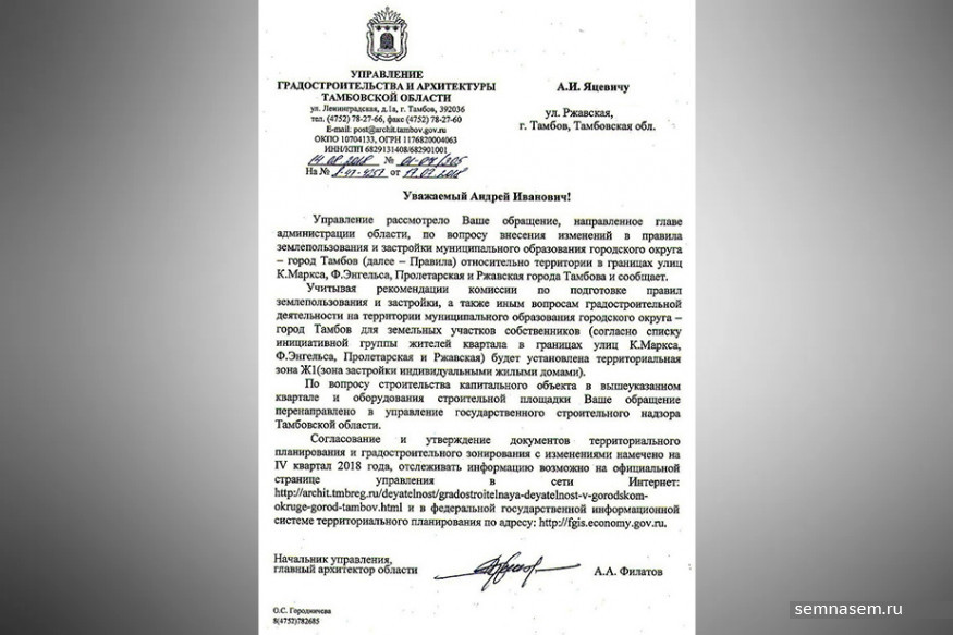 По словам участников инициативной группы жителей квартала, результата письма жителей и собственников не дали. Все протесты, направленные федеральным властям вернулись на местный уровень, а тамбовские чиновники, по мнению жителей, действуют в интересах застройщика.