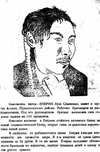 Но в то же время, на тех же газетных страницах можно было увидеть фотографии передовых охотников и рыбаков… с косами. Такими, как у хантыйского комсомольца Луки Еперина, который выполнял план рыбозаготовки на 110%, вербовал туземных детей в школу и даже сам учился грамоте. В общем, был образцовым советским хантом по всем статьям, вот только с косой не расставался.