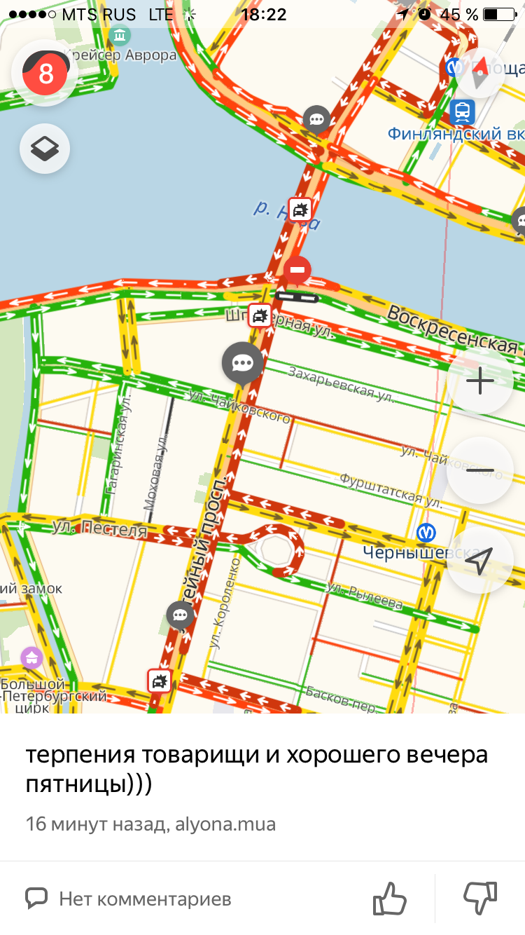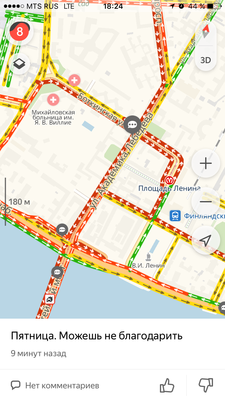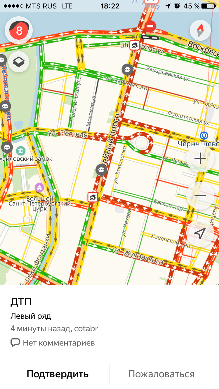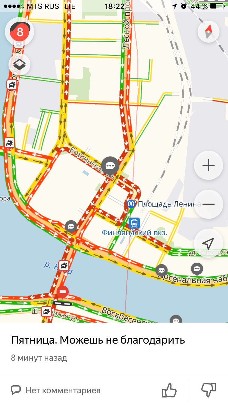 Вечером 30 ноября в Петербурге снова образовались 8-балльные пробки. Судя по сервису «Яндекс.Карты», на Лиговском проспекте к 18:30 заторы из-за четырех ДТП. Очевидцы также сообщают о авариях на Невском проспекте, рядом с Елагиным островом и на Пулковских высотах.