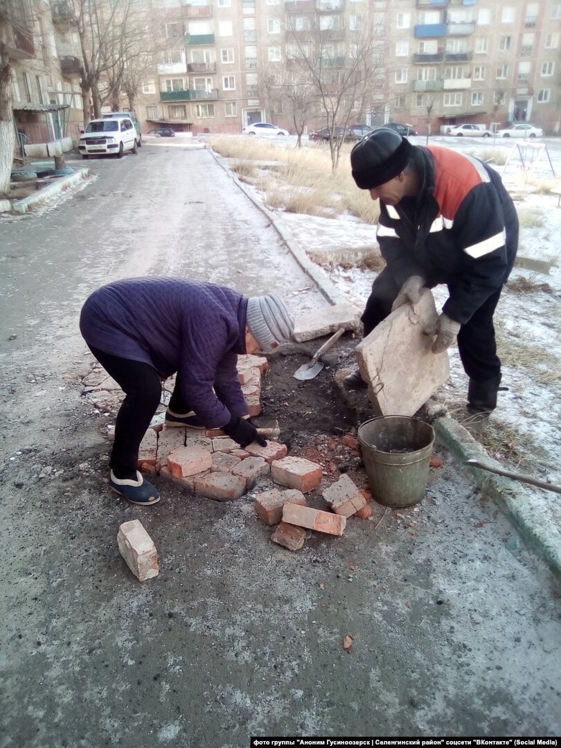В городе Гусиноозерске Республики Бурятии 72-летняя жительница вместе с соседом заделала яму на дороге около своего дома.