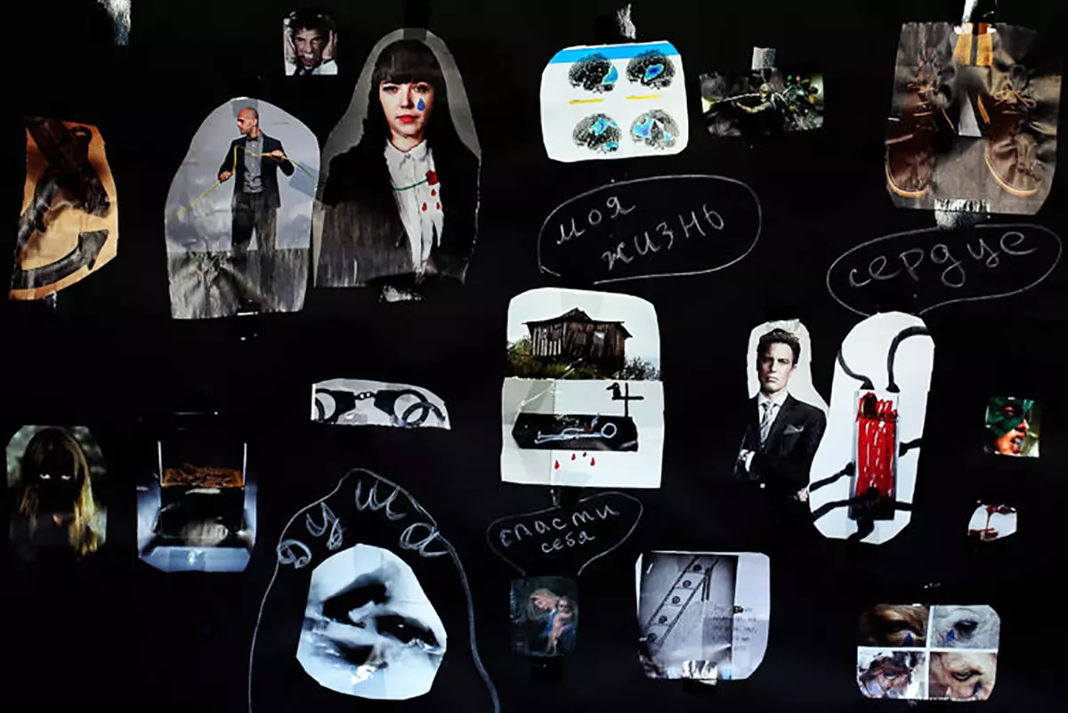 — Мы даем зрителю возможность выбрать – можно только прочесть истории, либо только посмотреть коллажи, либо сделать и то, и другое. Все зависит от того, насколько травматична эта информация — мы бережем зрителя, это важно. Сами коллажи, это вырезки из газет, журналов, которые клиентки выбирают и компонуют сами. Бывший главред «Теплицы социальных технологий» Олег Гант сфотографировал коллажи, мы распечатали их в большом формате. Очень интересное высказывание получилось — с одной стороны это арт-терапия, когда образами и фразами пытаешься рассказать историю не от себя, а собрать её из того, что ты видишь, в коллаж. С другой стороны это ещё и не совсем искусство, это очень личная история. Женщины молчат — за них говорят образы.