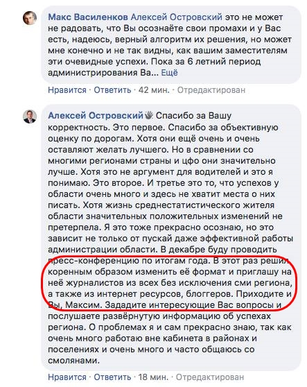 Напоминаю, что в этом году, в связи с указкой из Администрации Президента "быть открытыми", ВПЕРВЫЕ годовая пресс-конференция губернатора Алексея Островского состоится не только среди "своих" трубадуров режима, но и с приглашением "широких слоёв населения" Причем, даже требуя регистрацию на это мероприятие, Алексей Владимирович в сети ФБ активно приглашает придти и задать любые вопросы("даже неудобные!") всем смолянам. Ну что же, посмотрим, вместит ли КВЦ всех желающих, хотя некоторые "зубры местной журналистики" уже отказались идти на "протокольное, для галочки, мероприятие, направленное на повышение медийного рейтинга губернатора" И если потерю не совсем адекватного Тихонова можно пережить, то отсутствие Захарова и Асадчего понизит уровень остроты этого действия... С другой стороны, если может придти любой смолянин и задать острый вопрос, то что-то мне подсказывает, что будут "интересные моменты"., тем более будет вестись прямая трансляция Само собой, всем интересно знать, чем закончится публикация личной переписки Главы и губернатора с антизаконными указаниями последнего. В общем, "представители гражданской журналистики (блогеры)" (я так понимаю, журналистов из официальных СМИ губернатор "гражданскими журналистами" не считает), регистрируемся по ссылке и пишем свои пожелания. Я уже это сделал