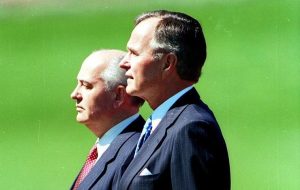 • Буш никогда публично не выражал радость в связи с крахом Советского Союза. И своими сдержанными публичными комментариями «склонил Советский Союз к полной капитуляции», «никогда не давая Москве поводов для отмены курса», писали историк Майкл Бешлосс и американский дипломат Строб Тэлботт в книге 1993 года «На высших уровнях: внутренняя история конца холодной войны».