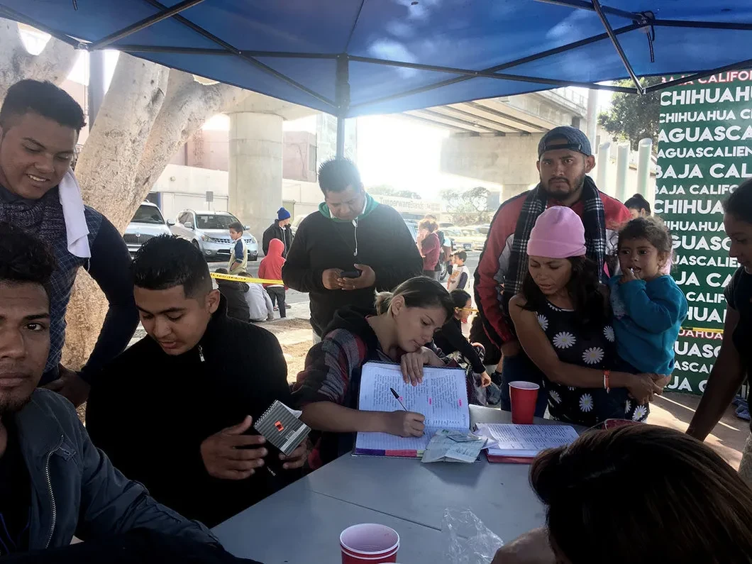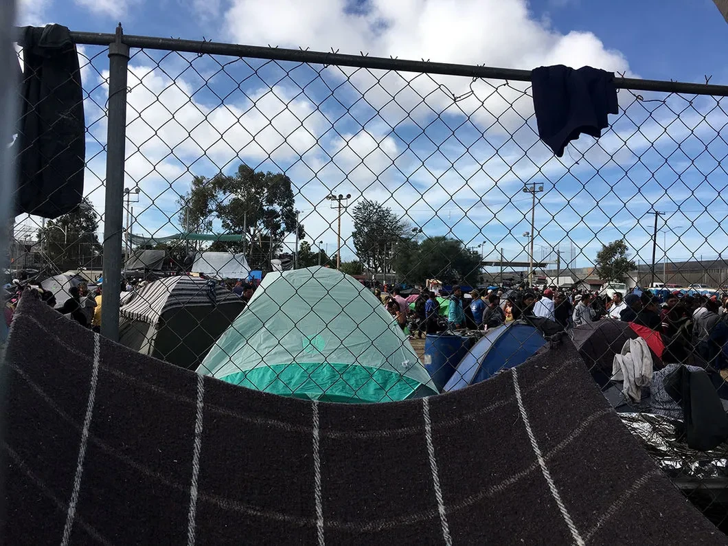 Со стороны Мексики перед футуристическим зданием перехода стоит тряпичная палаточка. Волонтеры, набранные из последнего каравана, записывают в тетрадку имена. Здесь формируется очередь, чтобы попасть внутрь терминала и попросить пограничных офицеров об убежище.