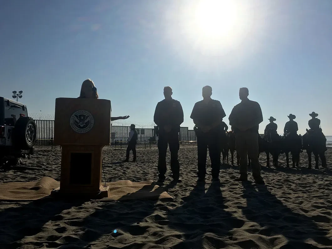 Перед стеной лежит несколько свежих мотков колючей проволоки. Рядом с ними стоит деревянная трибуна с орлом. Ожидается визит Кирстен Нильсен, министра внутренней безопасности США. До этого были слухи о ее скорой отставке — Трампу не нравится, что Кирстен, дочь датчанина и итальянки, недостаточно решительно борется с миграцией.