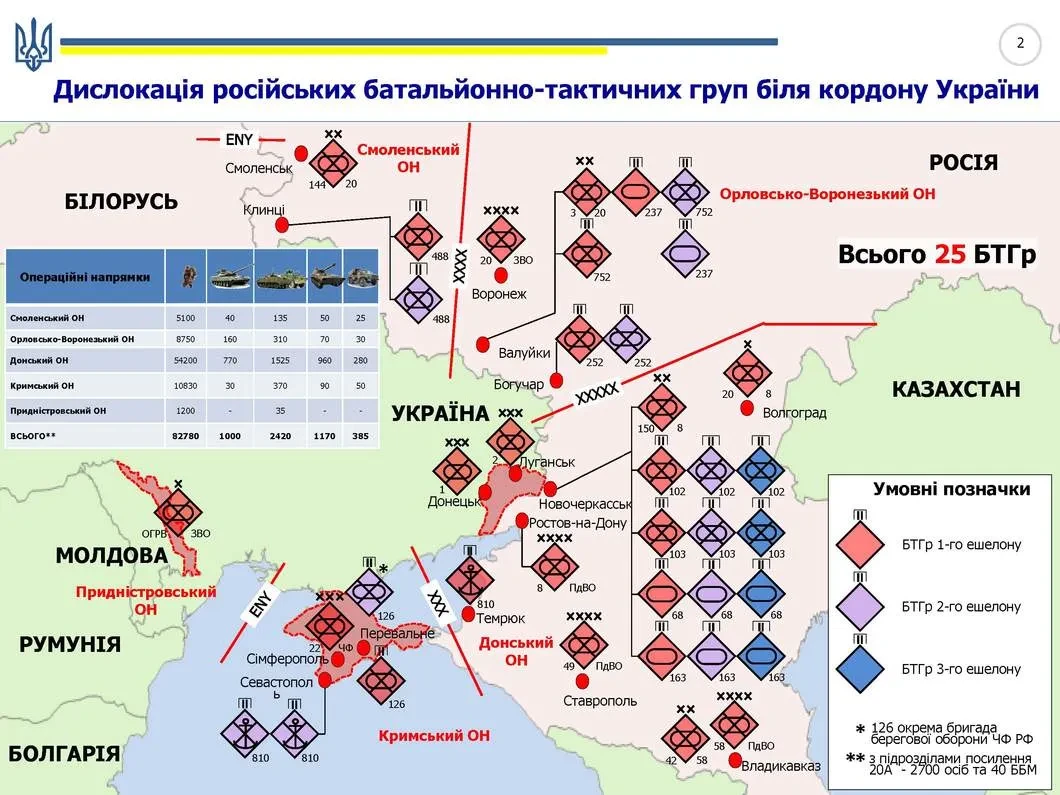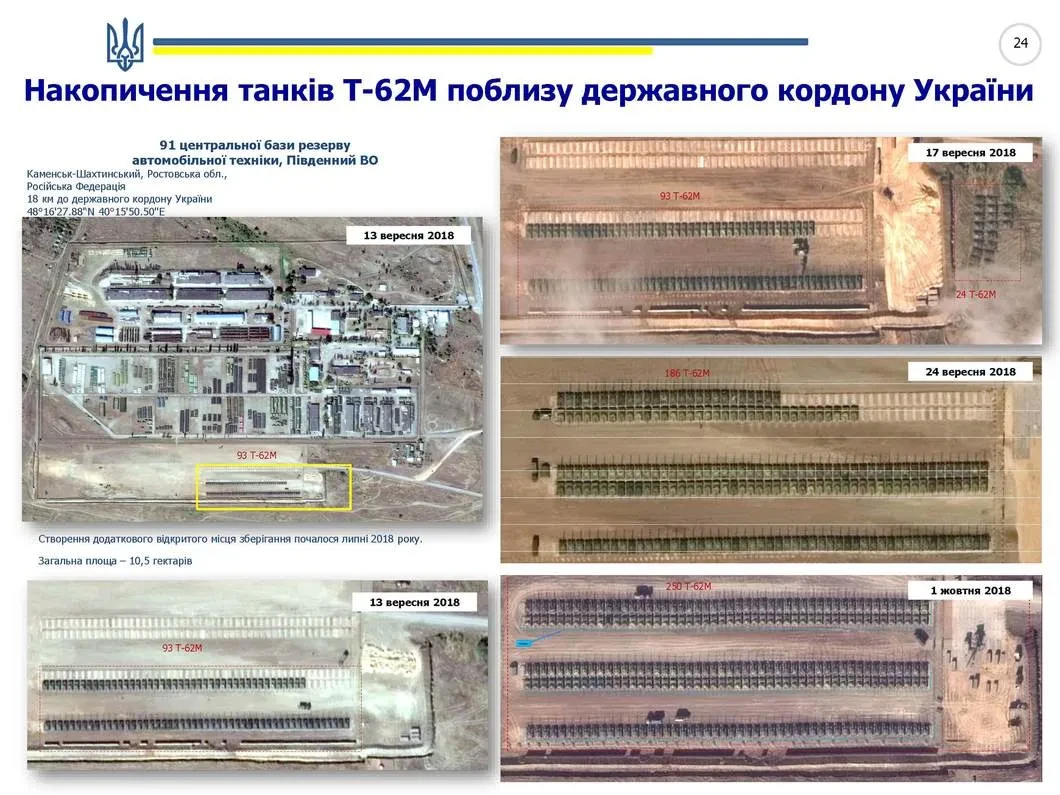 На восточных границах страны со стороны России сосредоточено 80 тысяч военнослужащих из элитных подразделений: батальонно-тактические группы, танковые соединения, ударная авиация, подразделения ракетной артиллерии, спецподразделения ГРУ и МВД РФ, разворачиваются полевые госпитали, сообщил в фейсбуке Зорян Шкиряк, советник министра внутренних дел Украины, подчеркивая, что он не пугает народ, а только констатирует факты. В августе 2014-го, затем в 2015 году подобные сообщения подтверждались спутниковой съемкой, публикуемой миссией США в НАТО. Их комментировал, в частности, нидерландский бригадный генерал, директор Комплексного кризисного центра управления операциями Нико Так. Актуальные кадры космической съемки-2018 пока не обнародованы.