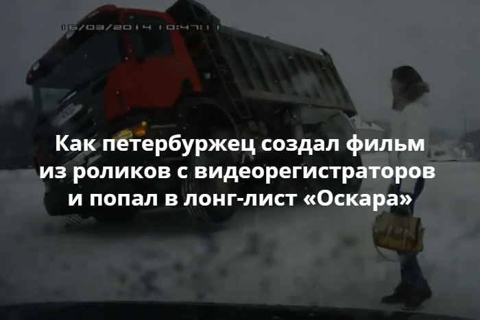 — В какой-то момент мне показалось, что записи с видеорегистраторов очень интересны с точки зрения документального кино. Они не просто забавные или страшные — в них есть что-то из-за способа съемки. Всё происходит совершенно случайно, никто не контролирует камеру. Как водитель поставил, так она и стоит, а потом о ней забывают и не трогают, пока не происходит что-то, что стоит сохранить. Композиция, освещение, ракурс, сами действия и условные сюжеты — случайны.
