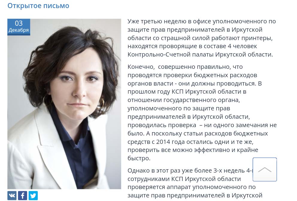 Исполняющая обязанности уполномоченного по защите прав предпринимателей Иркутской области Эвелина Секулович заявила об административном давлении на нее. Открытое письмо она разместила 3 декабря на официальном сайте организации. В счетной палате корреспонденту "Сибирь.Реалии" проведение "заказных проверок" опровергли.