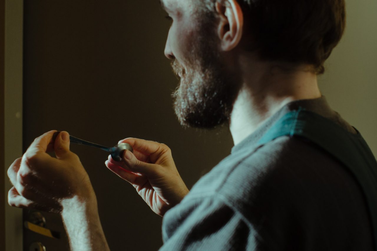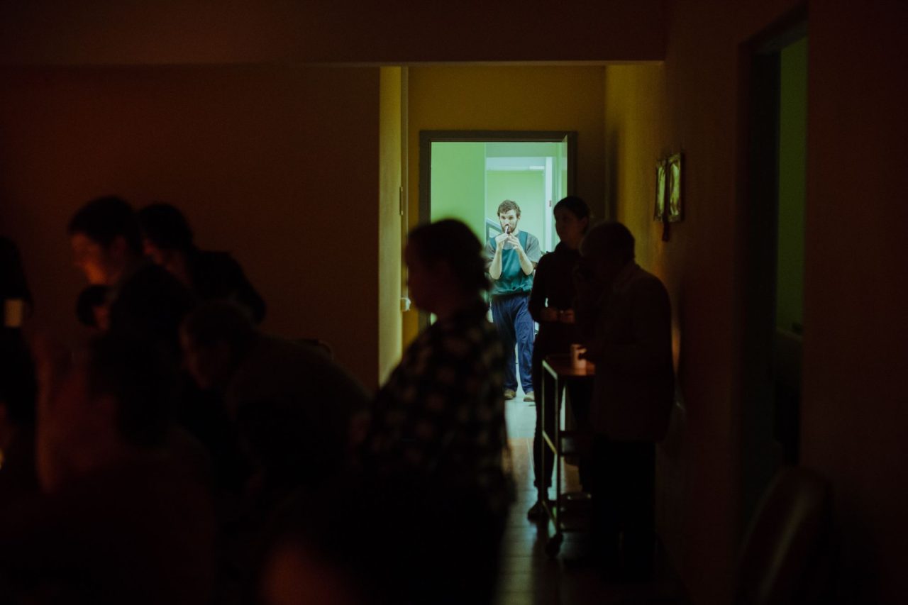 У Саши тонкое лицо с острыми скулами, впалыми щеками и густой бородой. В паузах между работой в свечной мастерской он ходит по коридору. Впереди преграда — закрытая на щеколду пластиковая перегородка. Иногда она остается открытой, и Саша спускается вниз: ему плохо и беспокойно, он пытается всеми силами с этим справиться. Хождения и еда — один из способов.