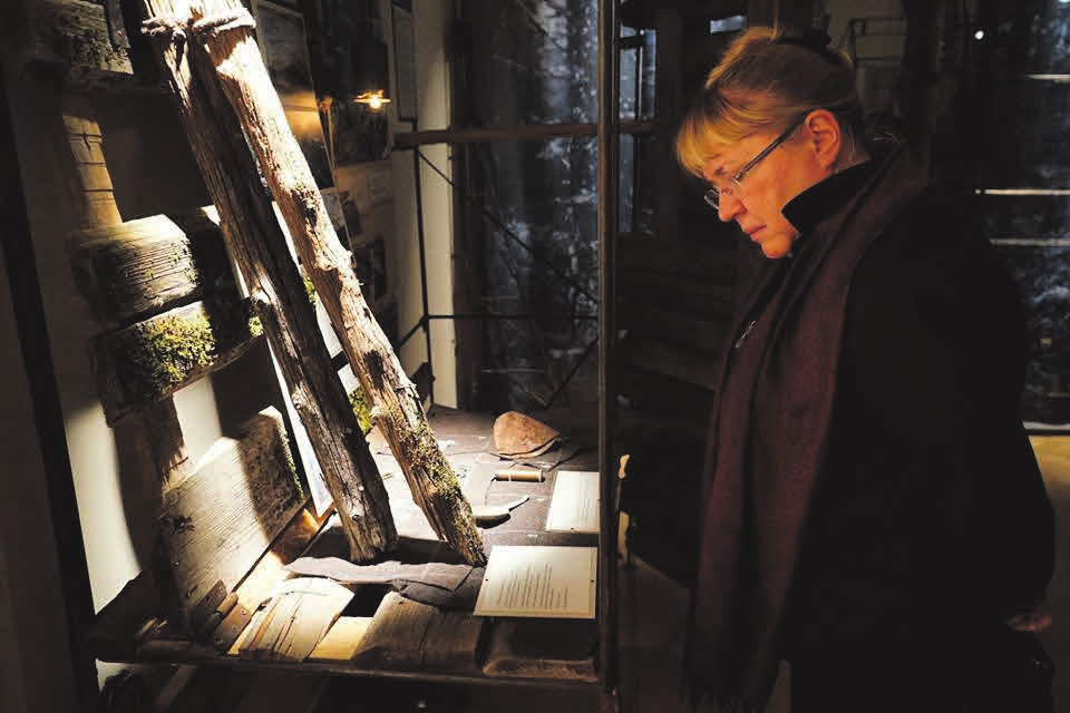 Для того, чтобы травы стали символами памяти о замученных людях, мы решили рассказывать эту историю театральным языком. Поэтому перечень основных участников выставки звучит так: сценография Петра Пастернака, свет Зиновия Бланка, художник Мария Волохонская, дизайн афиши Ирины Дилоян, типографика и верстка Виктории Кибе, звук Александра Шилова. И выставка выглядит как театральные декорации, внутрь которых можно попасть: тюремная дверь; красивое человеческое движение и пожелание хорошей дороги и жизни; лес с пнями разной высоты, потому что не у всех были силы протоптать снег; лагерная вышка размером с человеческую голову над занавесом с узкими проходами; железный поезд с коллажем их архивных фотографий; военный снимок, на котором видна дорога, бараки и зарастающие вырубки; лампа, и пока держишь палец, она горит, и вместо темных силуэтов и пустот видны человеческие лица; имена на бревне барака; фанерный чемоданчик — символ возвращения (фото 5).