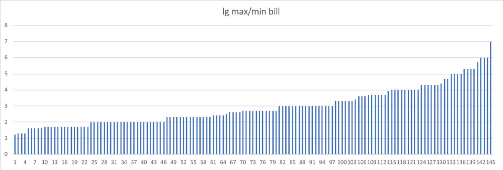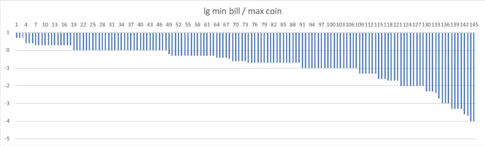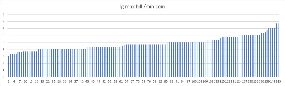 Максимальный номинал в современных, по нашему критерию, системах — 5 млн донгов (Вьетнам; рис. 12); впрочем, еще недавно встречались и более грандиозные банкноты, скажем, 100 трлн зимбабвийских долл. (рис. 13), а в истории инфляции известны послевоенные венгерские банкноты 1 000 000 000 билпе́нгё (рис. 14; 1 билпенгё = 1 000 000 милпенгё = 1 000 000 000 000 пенгё). Как и в случае монет, наблюдаемое разнообразие минимальных номиналов меньше, чем максимальных (рис. 15). Разброс номиналов внутри одной системы варьирует от чуть более одного порядка (3 и 50 долл. Островов Кука) до семи порядков во Вьетнаме (рис. 16). Разброс для 100 стран укладывается между двумя и четырьмя порядками, что также шире, чем для монет.