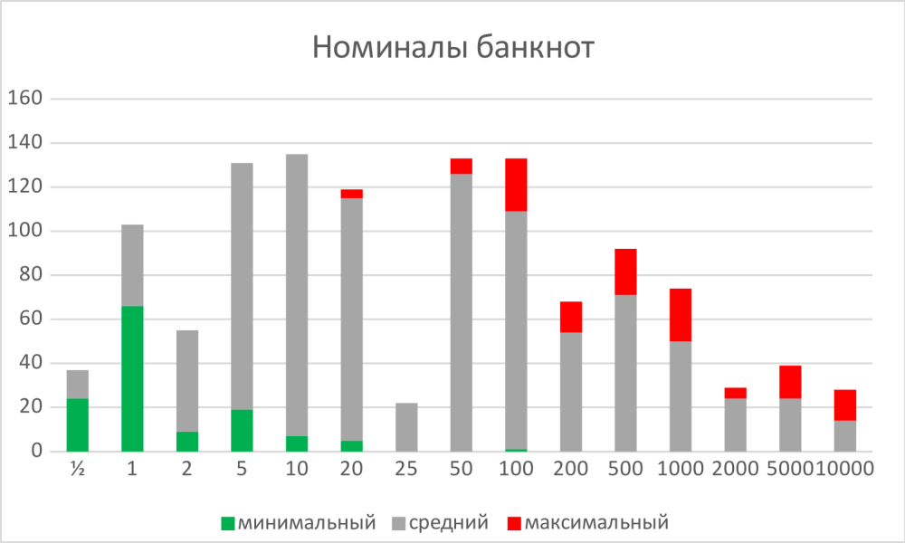 А теперь посмотрим на деньги настоящих стран. Для этого воспользуемся данными о номиналах монет и банкнот из двух популярных интернет-каталогов [1, 2]. Для каждой страны будем рассматривать последнюю серию чеканки и печати, как она определена в этих каталогах (иногда эта серия оказывается очень долгой, более ста лет, что вносит искажения, но таких случаев мало, а нам нужно формальное правило). Для европейских стран возьмем последнюю серию перед введением евро. Ограничимся денежными системами, в которых сто мелких единиц (будем обозначать их ¢) равны одной крупной ($); впрочем, разрешим существование промежуточной единицы (=10¢=0,1$). Не будем рассматривать памятные и инвестиционные монеты. У нас останутся данные о системах 145 стран.