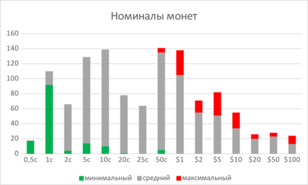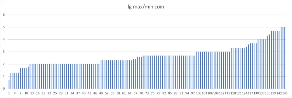 Самый мелкий номинал монет — ¼¢ (пайса, Непал, рис. 1), самый крупный — 5000$ (донг, Вьетнам, рис. 2), самый частый — 50¢ (141 страна), затем 10¢ (139) и 1$ (138). Эти три номинала, а также 5¢ практически никогда не пропускаются, если только попадают в интервал номиналов, которые вообще чеканятся. Интервал чеканки чаще всего начинается с 1¢ (92 страны); максимальный же номинал бывает разным: 1$ (33), 5$ (31), 10$ (21) и т. д. (рис. 3). Разброс номиналов монет в большинстве случаев составляет два-три порядка (рис. 4; в этот интервал укладываются 105 стран из 145), хотя может быть и меньше (Лаос: от 10 до 50 атт), и больше, до пяти порядков — от 1¢ до 1000$ (Италия, Колумбия, Парагвай).