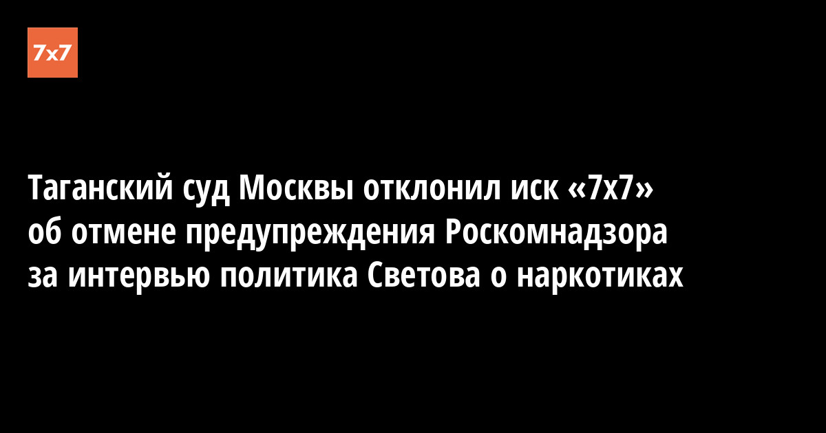 Таганский районный суд Москвы 4 декабря отклонил иск интернет-журнала «7x7» об отмене предупреждения Роскомнадзора о недопустимости нарушения законодательства России за интервью политика Михаила Светова о легализации наркотиков. Об этом рассказали в Центре защиты прав СМИ, который защищал издание. В суде интересы «7x7» представлял адвокат Тумас Мисакян.