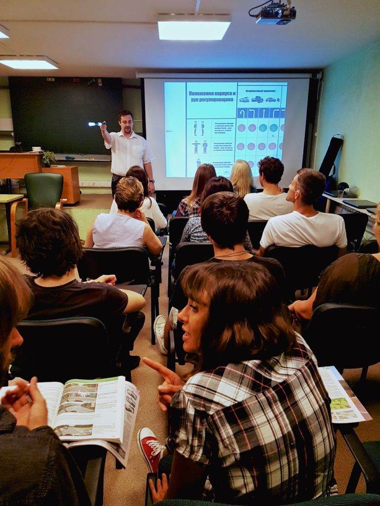 В университете я получил специализацию по психодраме — это метод психотерапии, который предполагает элементы импровизации при работе с людьми. Поэтому на своих занятиях я всегда использовал элемент игры. Например, для того, чтобы человек мог лучше понять, как двигаться на перекрестке, на котором стоит регулировщик, я брал настоящий жезл, выходил в центр аудитории и начинал изображать действия регулировщика. Потом отдавал жезл студентам, чтобы они сами отыграли эту ситуацию с обеих сторон.