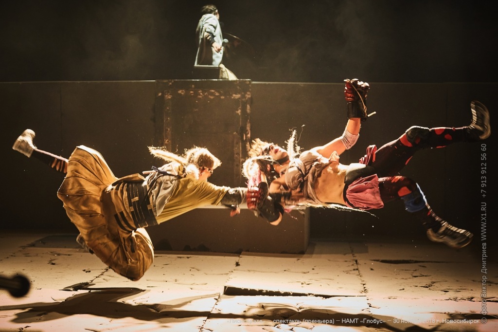 Пространство сцены заполнено огромными поролоновыми блоками серого цвета — вот и все декорации. Такой ход с одной стороны открещивает происходящее от реальности, добавляет метафоричности, а с другой — увеличивает зрелищность и темп: актеры не могут свободно ходить по мягкому покрытия, поэтому вынужденно скачут, в сценах борьбы опрокидывают друг друга через плечо как в реслинге, а в хореографических вставках двигаются с искаженной пластикой и усиленной амортизацией.